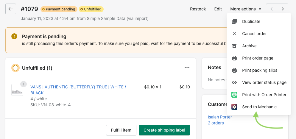 For supported Shopify resources, the "Send to Mechanic" action link can be found in the "More actions" menu. Click this link to route the currently-viewed Shopify resource to Mechanic.