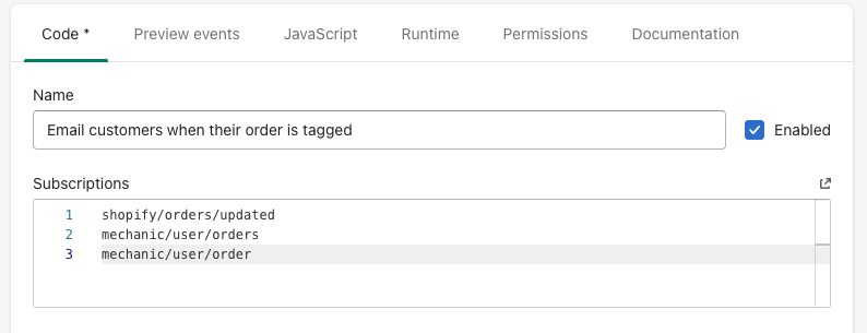 Tasks that already subscribe to related Shopify event topics lend themselves well to invocation via Shopify admin action links. For example, a task subscribing to shopify/orders/create may be adapted to these action links by adding mechanic/user/order to the task's subscriptions.