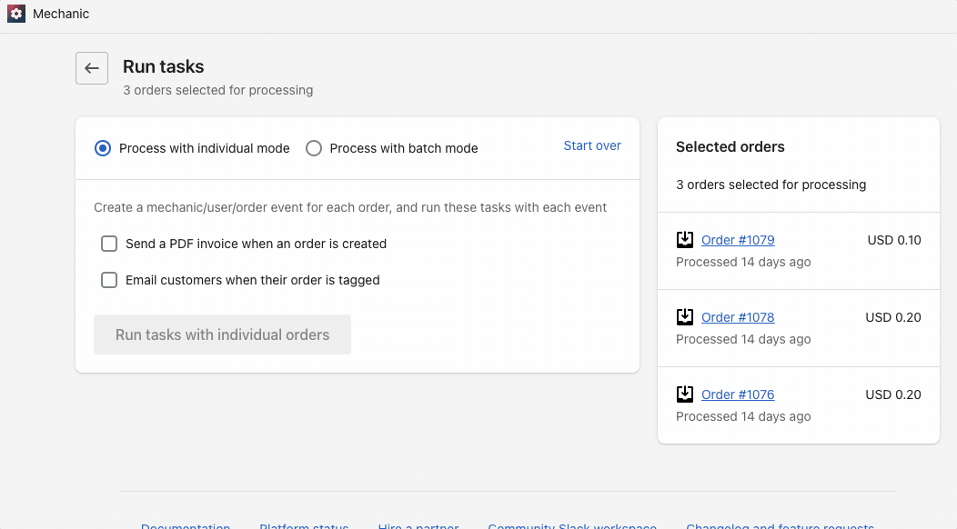 This mode creates an event for each selected Shopify resource, resulting in as many events as there were selected resources. Tasks subscribing to an individual mode event topic (e.g. mechanic/user/order or mechanic/user/customer) may use an [environment variable](https://learn.mechanic.dev/core/tasks/code/environment-variables) named after the singularized resource name, e.g. `order` or `customer`.
