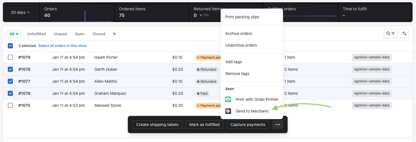 For supported resources, you'll find **"Send to Mechanic"** links within the Shopify admin. These links point to a Mechanic app URL that translates selected Shopify resources into Mechanic events for on-demand processing. Depending on the user's resource and task selections, their submission may result in one or more new events. Event data consists of the latest stable REST Admin API representation of the selected resource(s).