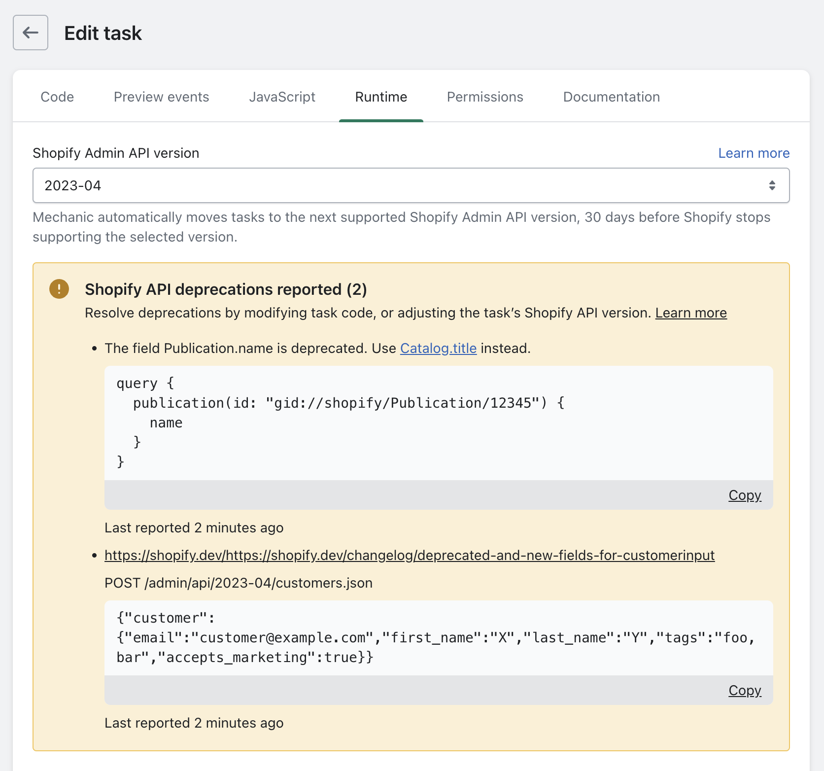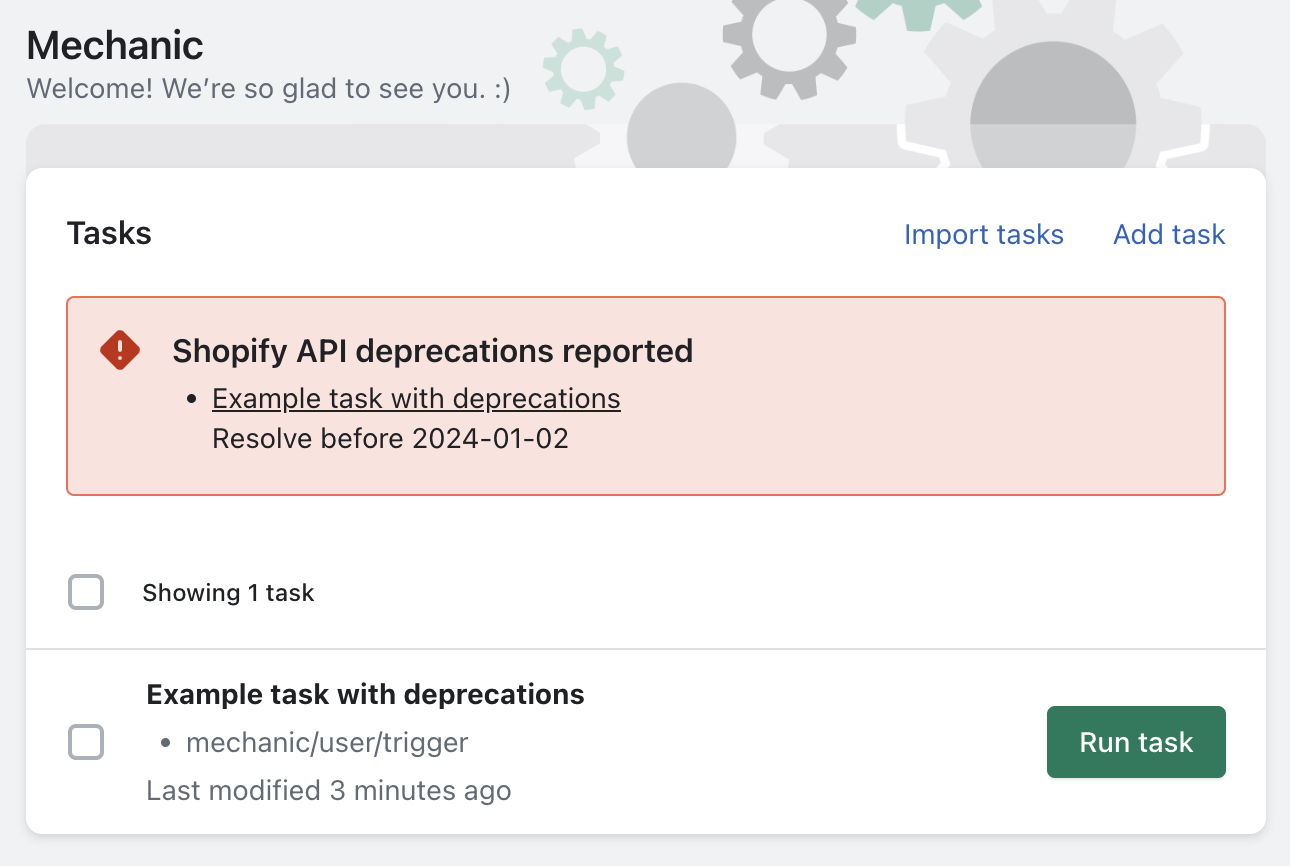 If support for a task's Shopify API version will be pulled soon, its deprecations will be shown above the main task list.