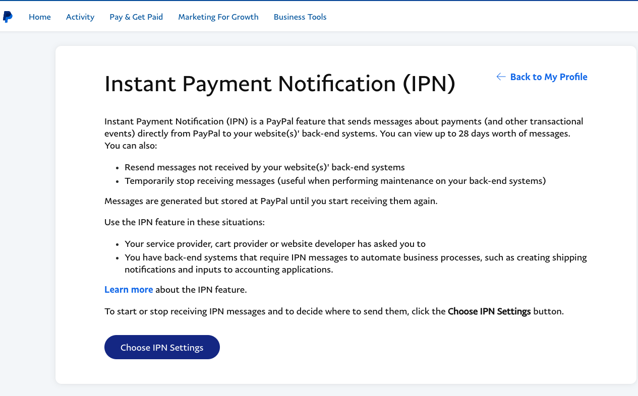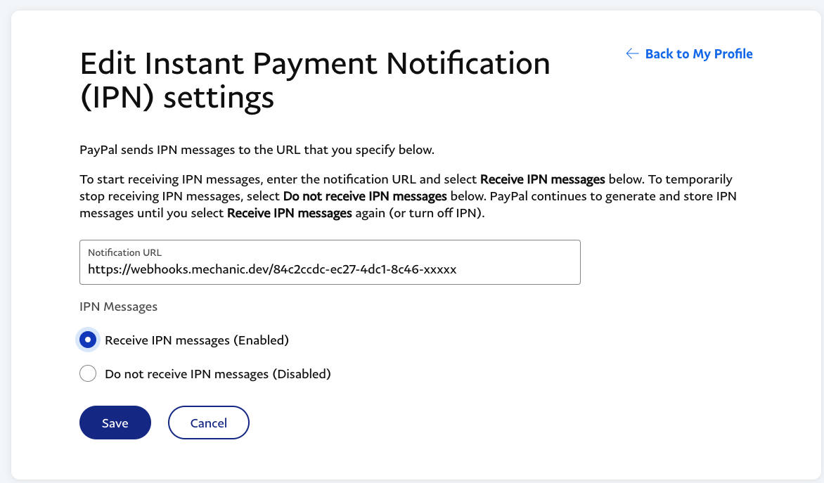 * [ ] Click the Choose IPN Settings button and then paste in your Mechanic webhook URL from Step 1 and choose the option to Receive IPN Messages and click Save.\\