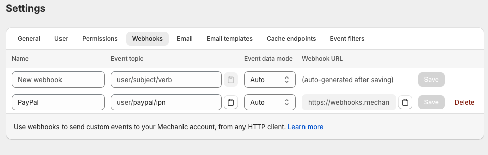 ### 1. Setup a Mechanic webhook that PayPal can send your transactions to
