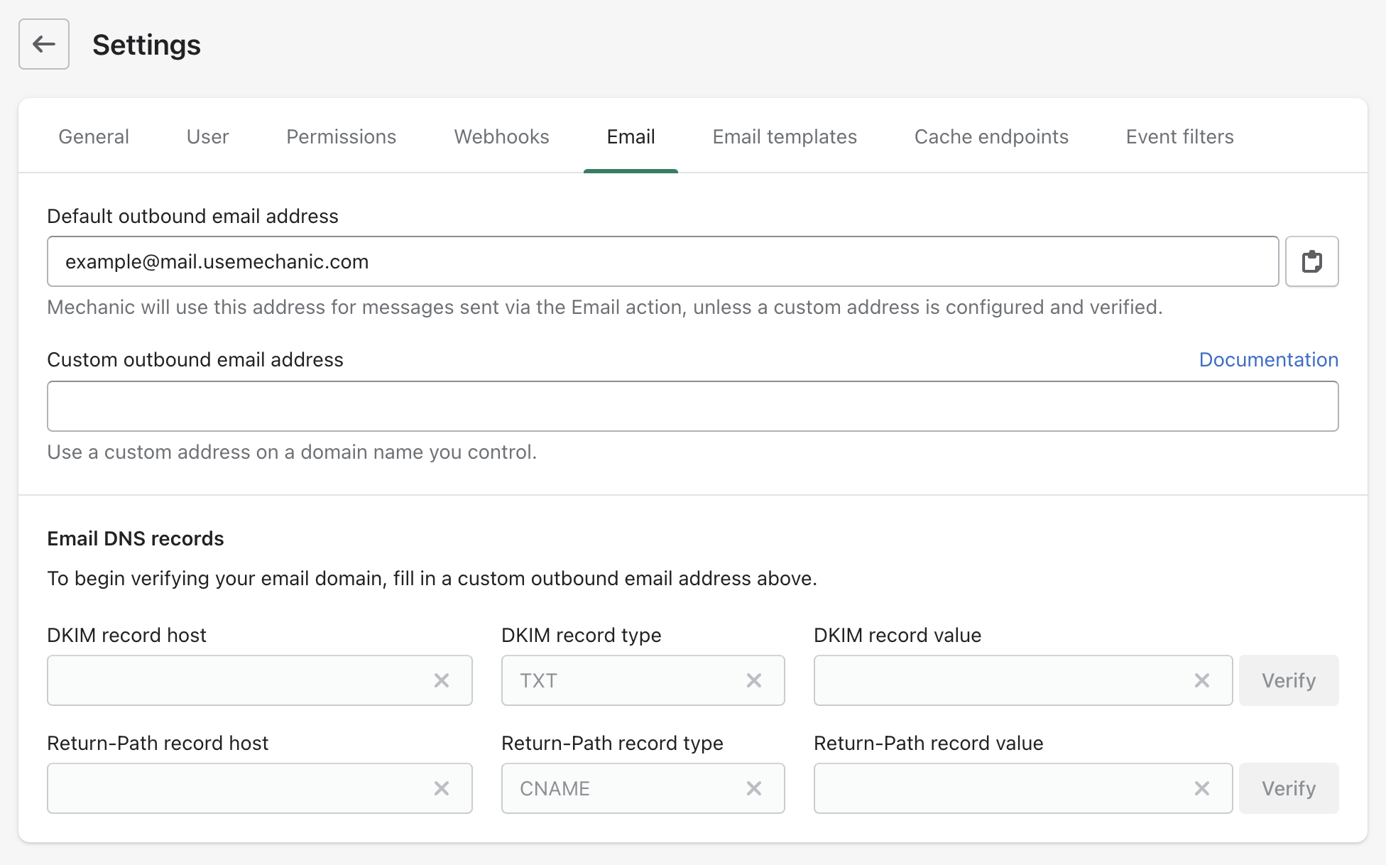 Mechanic requires verification of domain name ownership via DNS record. Once a custom email address is configured and approved, Mechanic will provide you with two DNS records to add to your domain. For help on adding these records, see Postmark's documentation: [Resources for adding DKIM and Return-Path records to DNS for common hosts and DNS providers](https://postmarkapp.com/support/article/1090-resources-for-adding-dkim-and-return-path-records-to-dns-for-common-hosts-and-dns-providers).