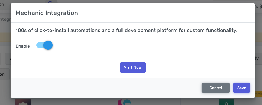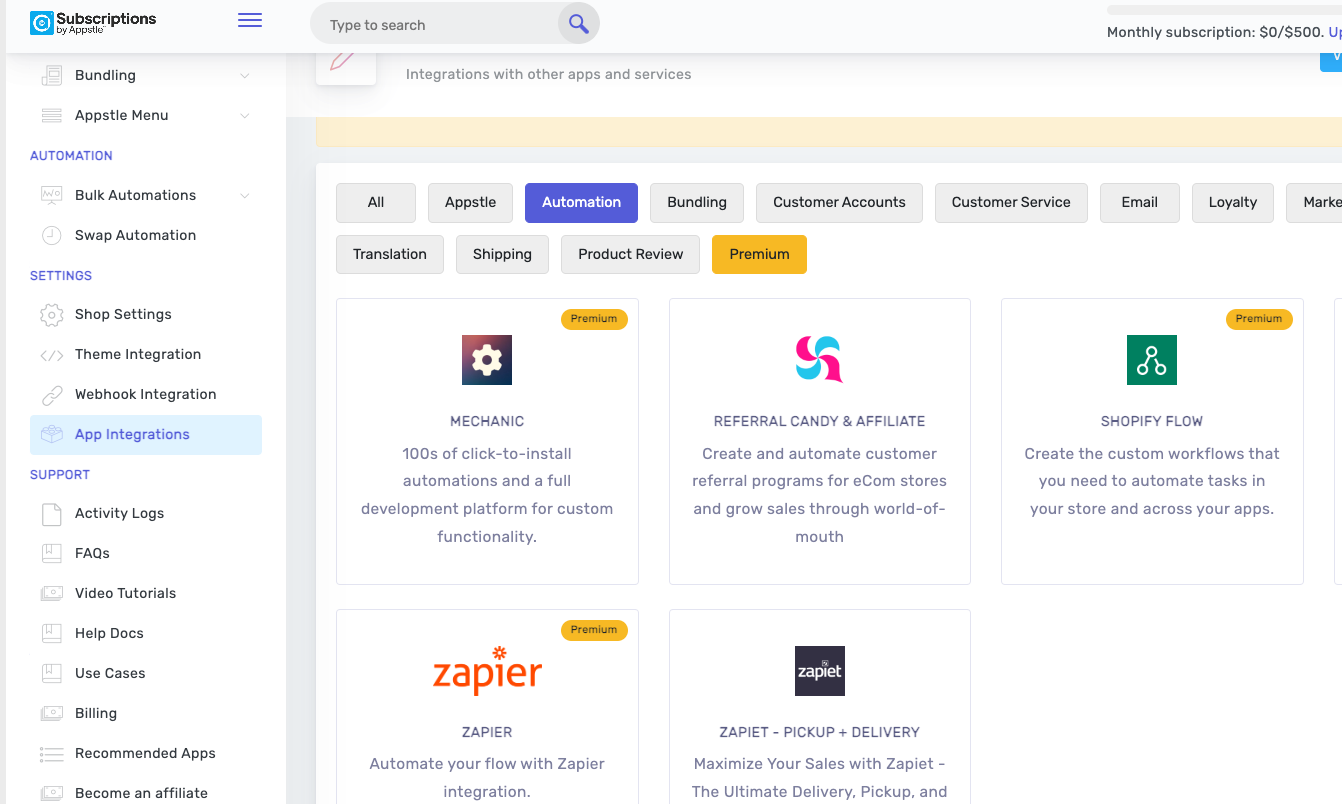 Enable the Mechanic integration under App integrations in the Appstle Subscriptions app: