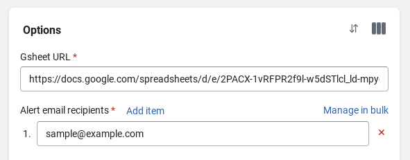 After adding the task you should update the **Gsheet URL** option field with the link to your sheet that was generated in the prior step. Update the **Alert email recipients** with one or more email addresses where you want to be notified in case Mechanic is not able to access the shared sheet (e.g. the share is disabled).