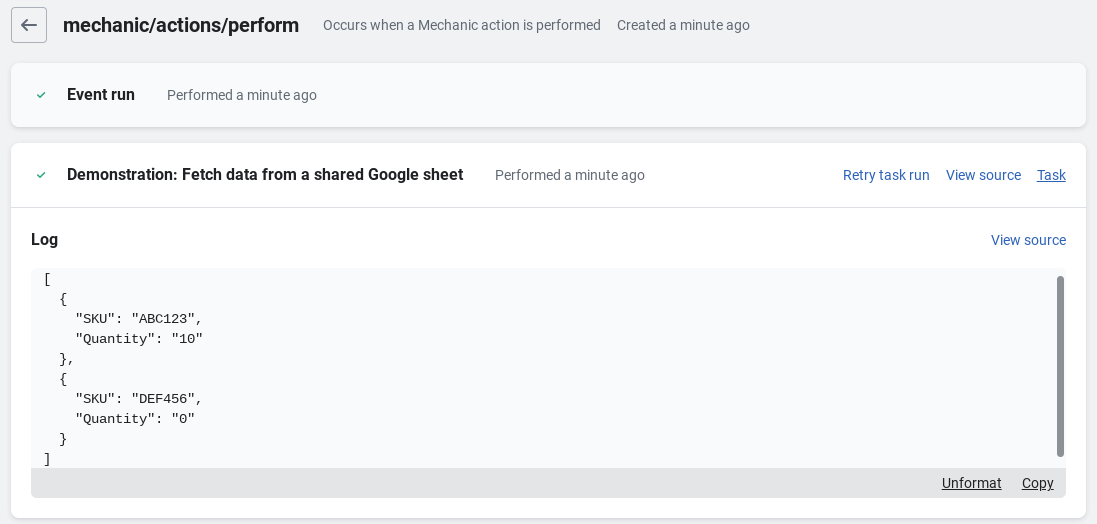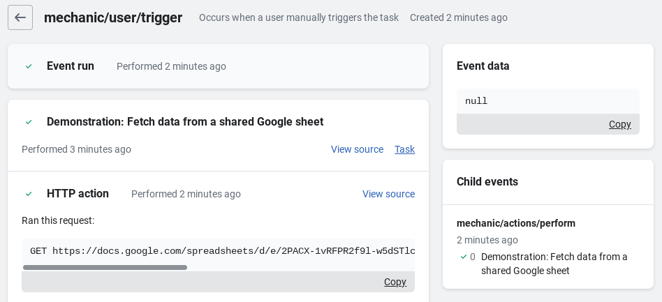 Run the task manually using the **Run task** button and it will run the first sequence of the task, which will make an **HTTP** request to **GET** the sheet data.