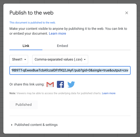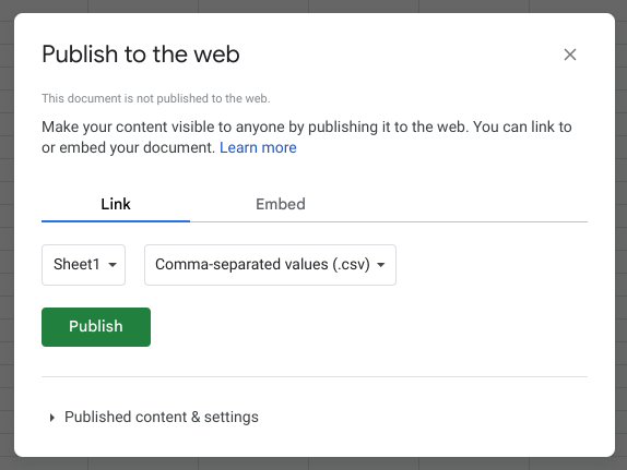 From the **Link** tab of the modal dialog that opens, select the sheet you wish to share and the *Comma-separated values (.csv)* option, and then click the **Publish** button.